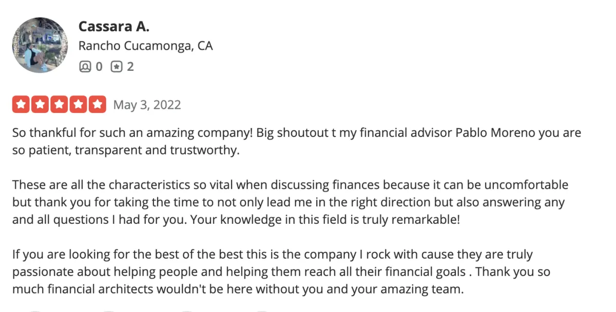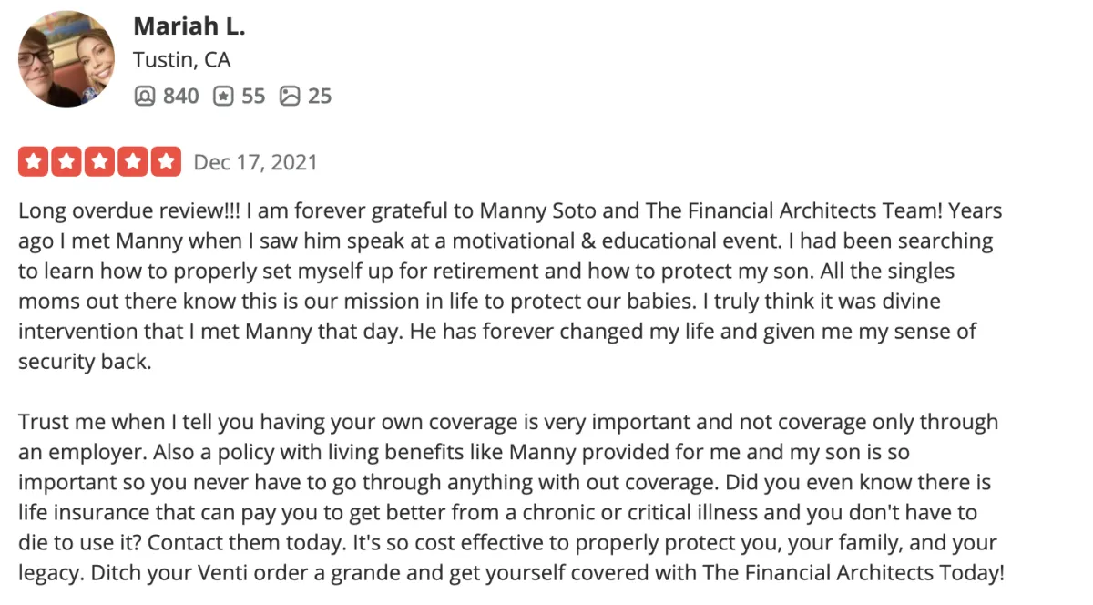 Disclaimer: Insurance products and services are offered through DMB Soto Insurance Services Inc. (#0K37904) DBA TFA Insurance Services, DBA The Financial Architects, an affiliated company. Advisory services are offered through The Financial Architects Wealth Management LLC, a Registered Investment Advisor in the State of California.